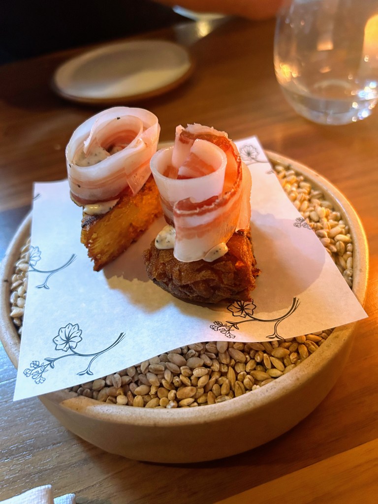 The french toast arrived next and was like a cloud of soft, buttery cheese on top of crispy french toast. The hash brown was like a mini breakfast bite, I am running out of superlatives already but the soft layers of potato with the salty cured pork on top made my mouth water like a dog waiting for a treat. They were sublime. By this point we’d got through a bottle of water and realised the accompanying wine only came with the first ‘offical’ course which was a snack and bread serving away. One advantage of being older, and other peoples opinions mattering less is the ability to ask for what you want. So when the bread arrived I asked if we could start the wine flight early. I am not sure if they have received this request before as I was advised they would ‘ask’ and a minute later a lovely crisp white arrived. BINGO. We enjoyed it with the bread and asked for another with our first course. It was the nicest wine pairing we had the entire meal. The staff at Alchemilla handled the request beautifully as well. When you are paying this much for a meal customer requests should be accomodated as widely as possible. We had one more snack, a scallop soup which came in a ceramic pot and was as difficult to photograph as it was unmemorable so onto more of the ‘great’.