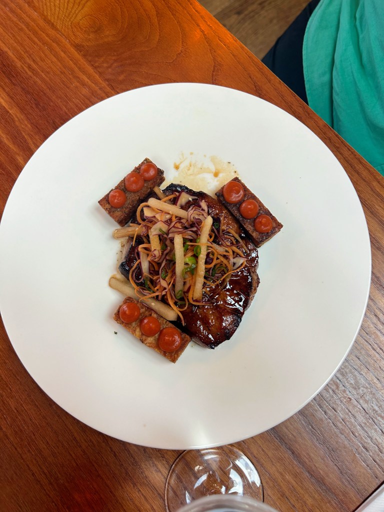 The Northerner was at home with the baby while I was with 2 school friends who have known me longer than we’d all care to admit and for the first time in 6 weeks I was free of an arm cast. I no longer needed to order something I could eat one handed so I didn’t even need to look at the menu. I was having a steak, wrist agony be damned. My friends ordered the fish and chips and the Pork Ribeye – which despite myself I couldn’t help but do a little ‘ooooh’ about. Sorry Emma. My steak was from Harkers which you can practically spit on from the restaurant but came on a plate that was way too big, this was a decent size steak but looked like postage stamp. Massive plates are one of my unreasonable hates – well I have reason, they rarely fit in dishwashers and make a decent portion look like it is for a Lilliputian. The chips were delicious, some of the best I have had. I loved the scored, meaty mushrooms and the heart shaped tomato saw me cooing again. The steak was good but not great, it had flavour and the fat was crisp (I like eating it, it is where the flavour is) so amped up the taste but it was a little overcooked. I asked for Medium Rare and I expect majority pink meat and a little blood but this was more Medium Well and tougher for it.