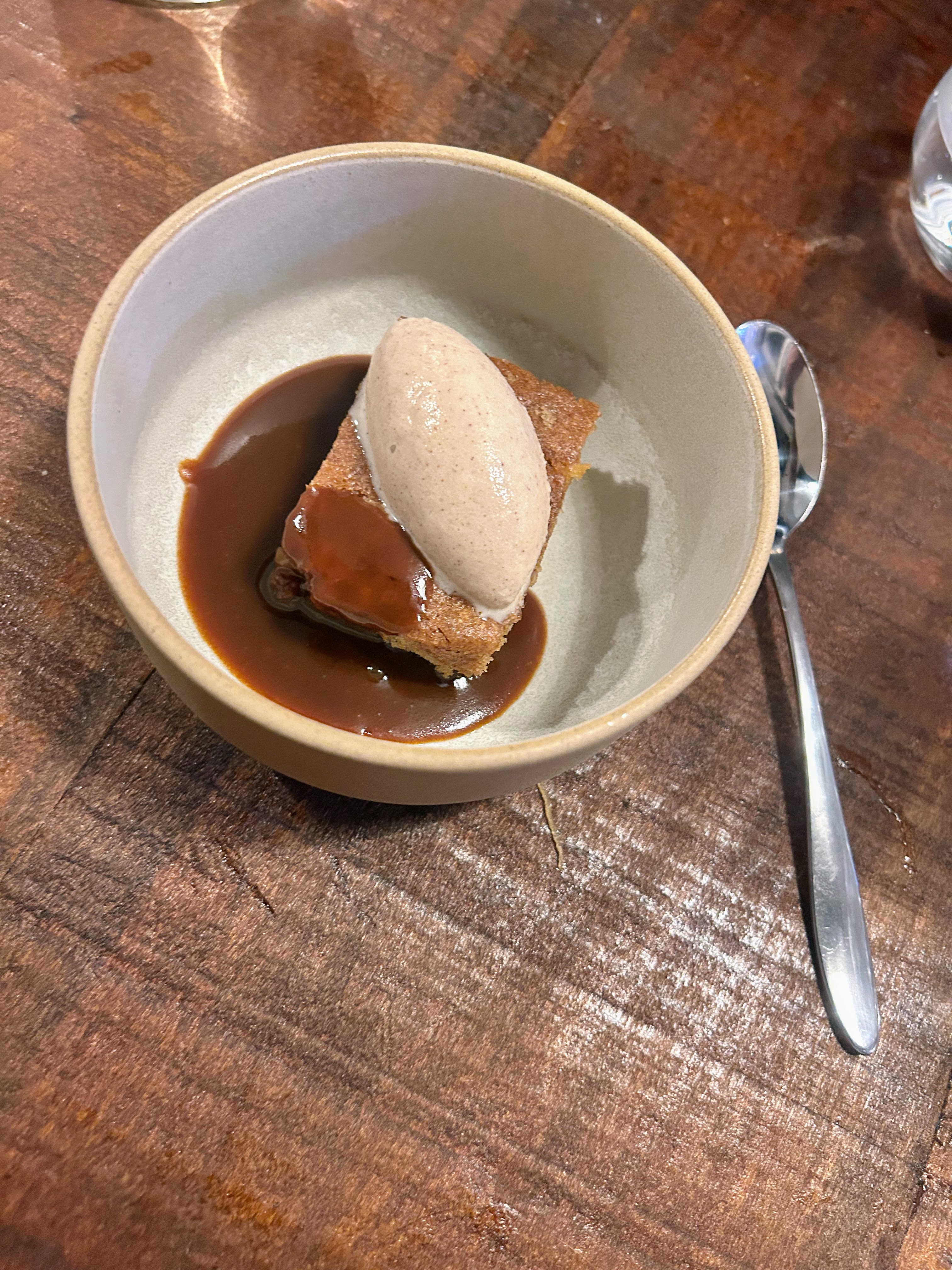 By this point there had been a few more missteps associated with newly opened restaurants (warm wine, the ‘buzz of a busy restaurant’ without any soft furnishings had tipped to ‘inability to have a conversation without raising your voice’) but I had my heart set on a pudding. The current menu offers 2 sweet desserts and cheese and crackers, I decided to go with my first instinct and have the Parsnip cake. It arrived looking far more elegant than most of the earlier dishes but I didn’t want to set my expectations too high. The first mouthful was a beacon of hope, sat next to the salmon dish screaming ‘LOOK WHAT WE CAN DO’. The cake was moist, warm and had a crisper top to add texture. The ice cream was smooth and had a nutty base that elevated it to elegant. The sauce was shiny, rich with honey flavour but dark with sweetness that put it’s arm around the other elements reassuringly. We only got one spoon so I coaxed The Northerner into trying some (by this point he had checked out) ‘That’s delicious’ he said and I was glad the night had a happy ending.