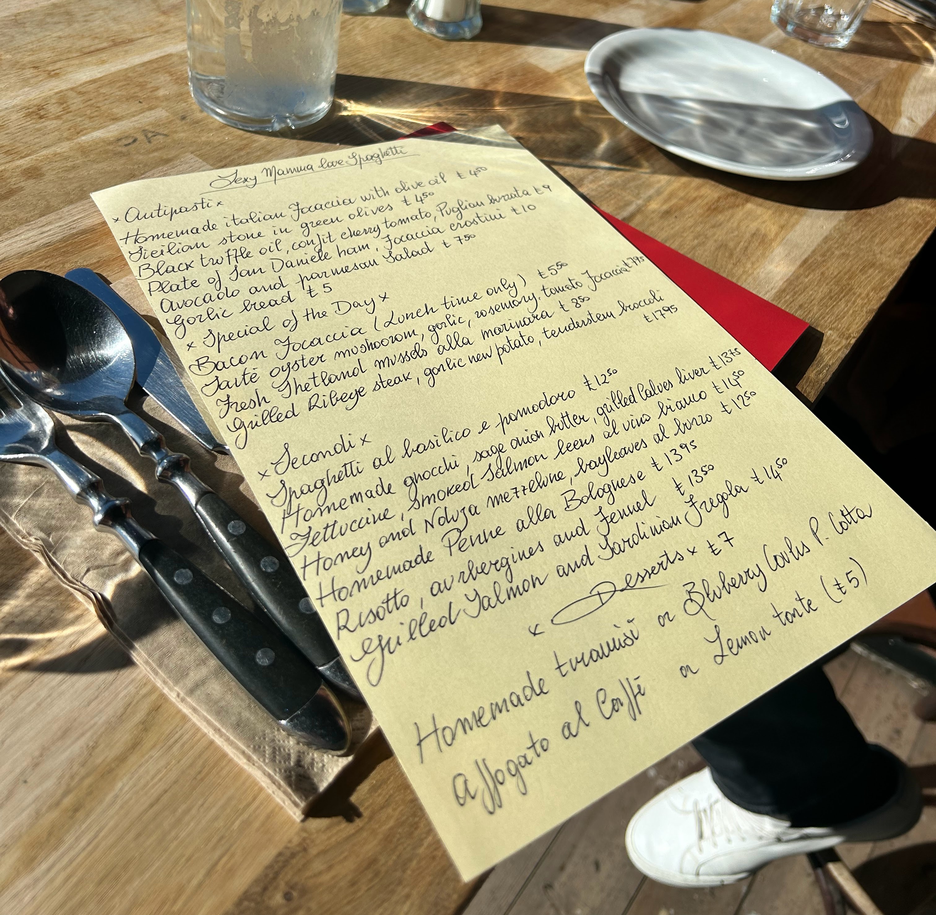 How to explain the decor inside? I am going to go for ‘eclectic’. The main restaurant looks like they’ve run out of room in the kitchen with bags of pasta, tinned tomatoes and general ‘stuff’ you don’t normally see in a restaurant (like a clamp securing the bar top to the fixings). This eccentric approach to the dining room makes me a little apprehensive but the music (Radio Monte Carlo 2) fills the restaurant with the most amazing soundtrack and; along with the cutlery, is reassuring. Someone has chosen that cutlery thinking about how it will feel when it is being held – I like that. The handwritten menu is a thing of beauty in my opinion, with most of the choices containing one element I haven’t heard of or can’t read. We asked the waiter for some advice and he took us through each element with passion and enthusiasm.