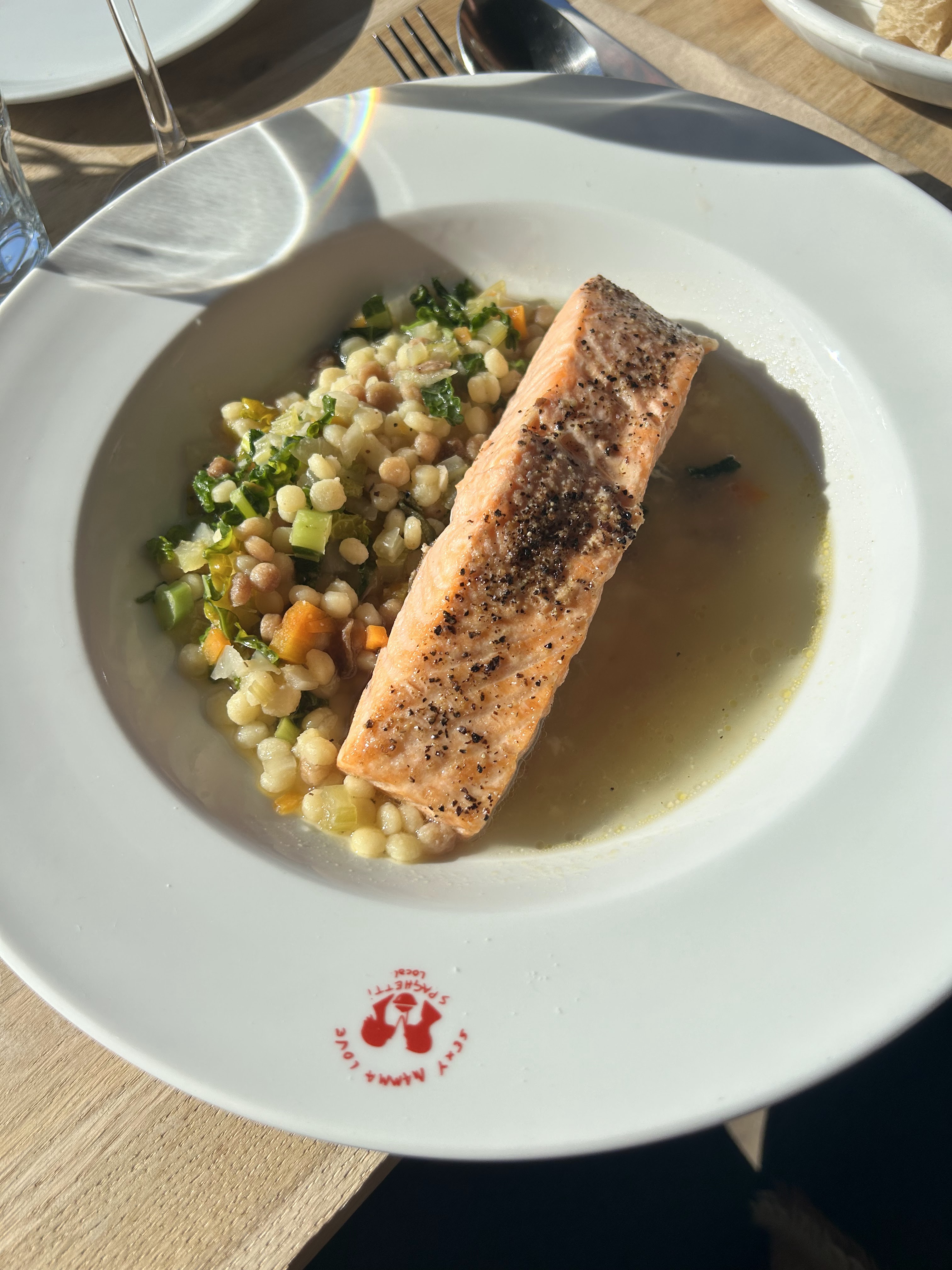The main courses arrived while I was in the bathroom, this never fails to remind me of the scene in Pulp Fiction “Don’t you just love it when you come back from the bathroom to find your food waiting for you?“. The Northerner’s plate of ragu and penne looked rich and delicious, I glanced at my salmon and felt like I had chosen badly. The waiter had described it as ‘comfort’ food but it looked more like a healthy broth. I shouldn’t have been influenced by the way it looked – as I tried a bit of salmon the fish flaked perfectly and the ground pepper on top of it added a welcome heat to the very well cooked fish. The pasta ‘broth’ was deep in umami flavour, I picked up the spoon and made sure each mouthful had every element of the dish in it. Together what looked ‘fresh’ and ‘light’ was actually a very clever dish that left me wanting more even after I had finished it all.