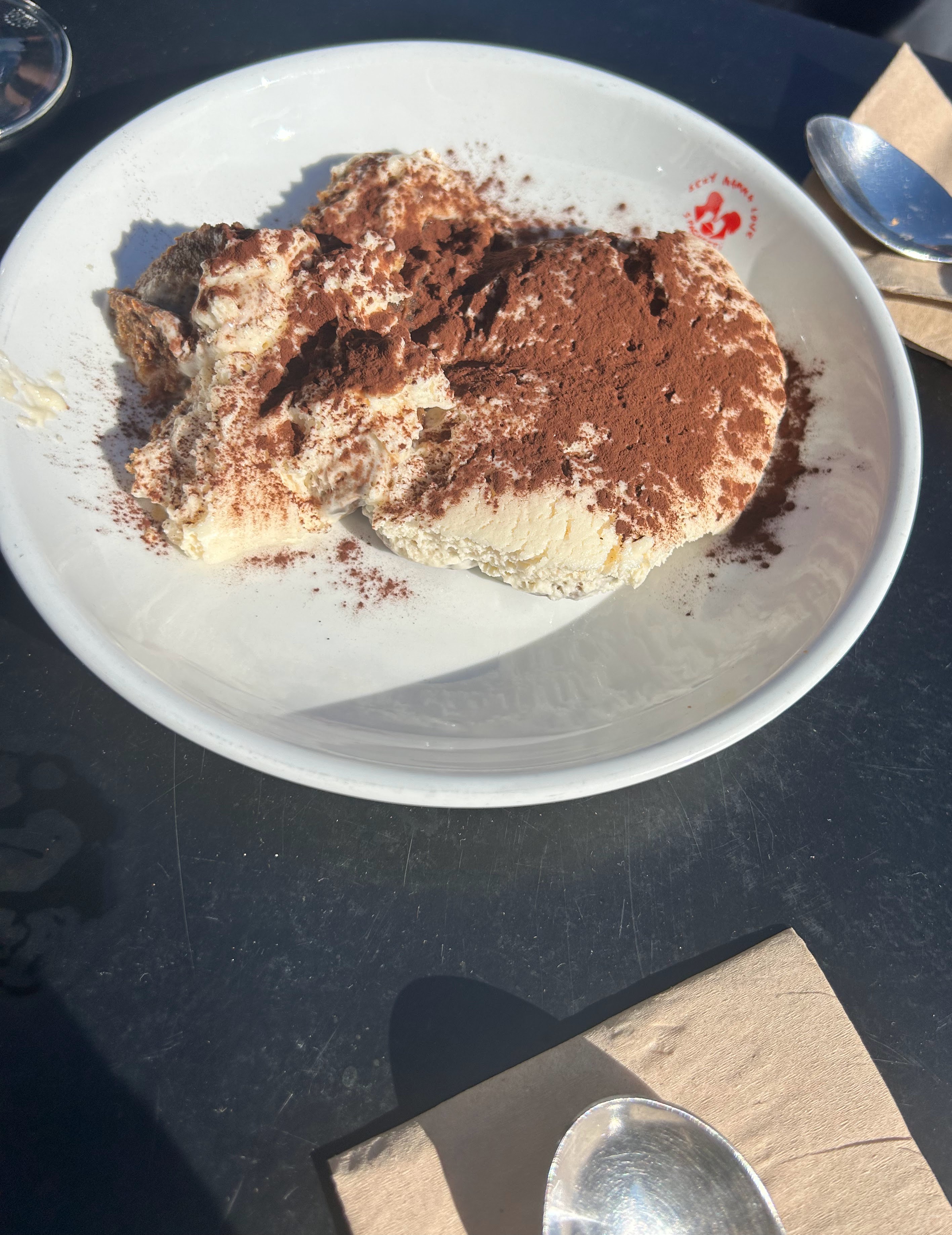 After being sat in the window (and direct sunshine for an hour) we were on the verge of overheating so decided to have pudding outside in the fresh air. Despite a lot of choice on the main menu, the pudding menu is paired back. 4 choices in total but they may as well only have 1, if Tiramisu is on the menu I am ordering it.