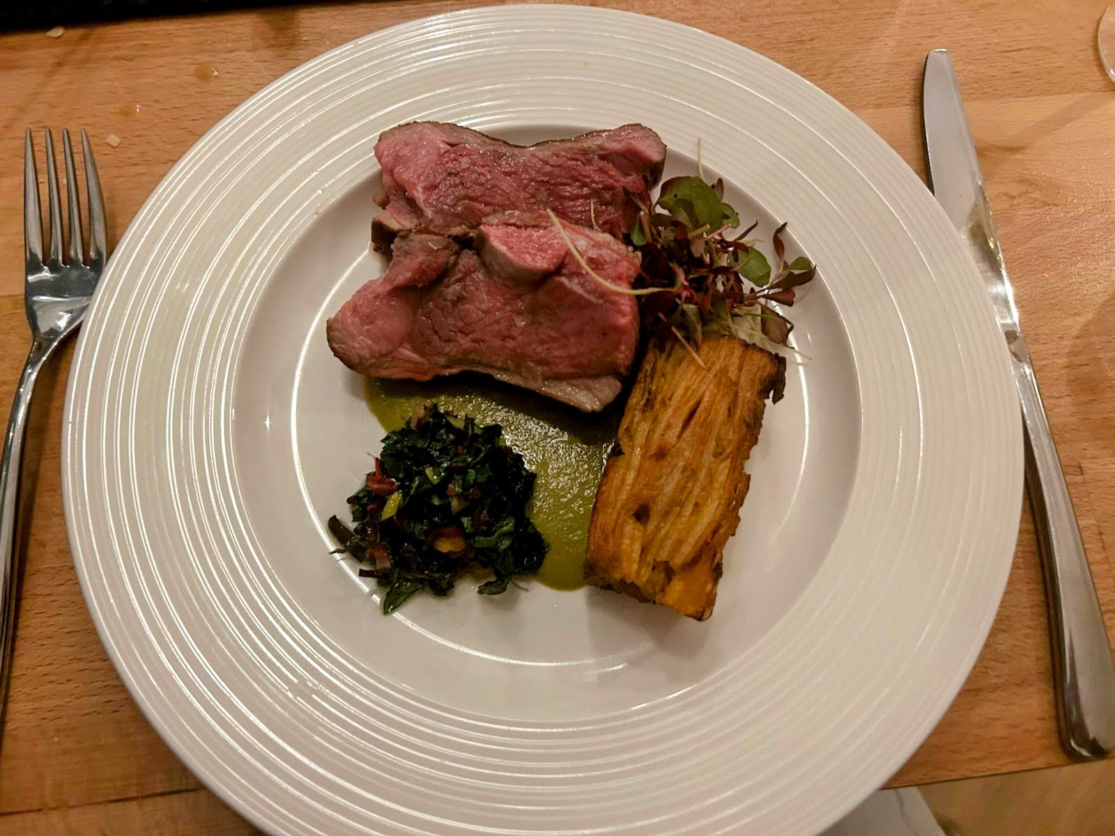 My Lamb Rump and Pomme Anna was definitely more of a ‘looker’ although there was clearly quite a lot of sinew on the lamb and I wondered if this was the best way to cook this cut. Readers, with hindsight, it wasn’t. I struggled to get through most of the mouthfuls of lamb despite some quite determined chewing and had to take a few pieces out of my mouth. The Pomme Anna was delicious, the compressed soft potato slices well seasoned and crisp. Unfortunately the Salsa Verde struggled to hang around on the palette in the face of the tough lamb. When the server came to the table after we had finished she asked how it was and pointedly eyed the lamb. I have had a birthday since my last blog and as I get older my confidence grows so I just delivered the feedback in the kindest way possible ‘The lamb was tough, I couldn’t eat much of it. Sorry’. She apologised and removed the bread and olives from the bill. The irony wasn’t lost on me that it was the part of the meal I had enjoyed the most.