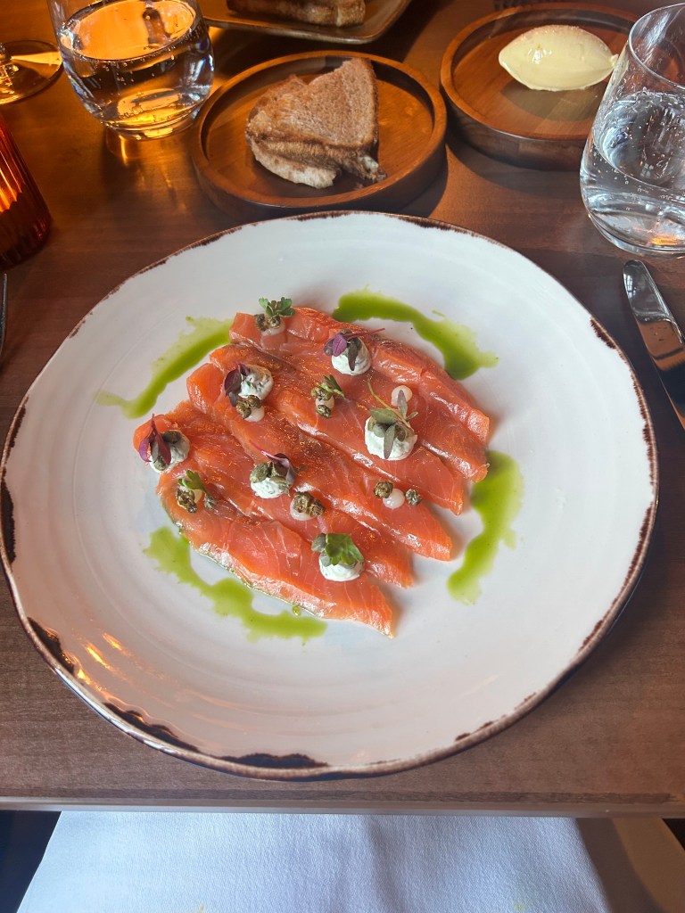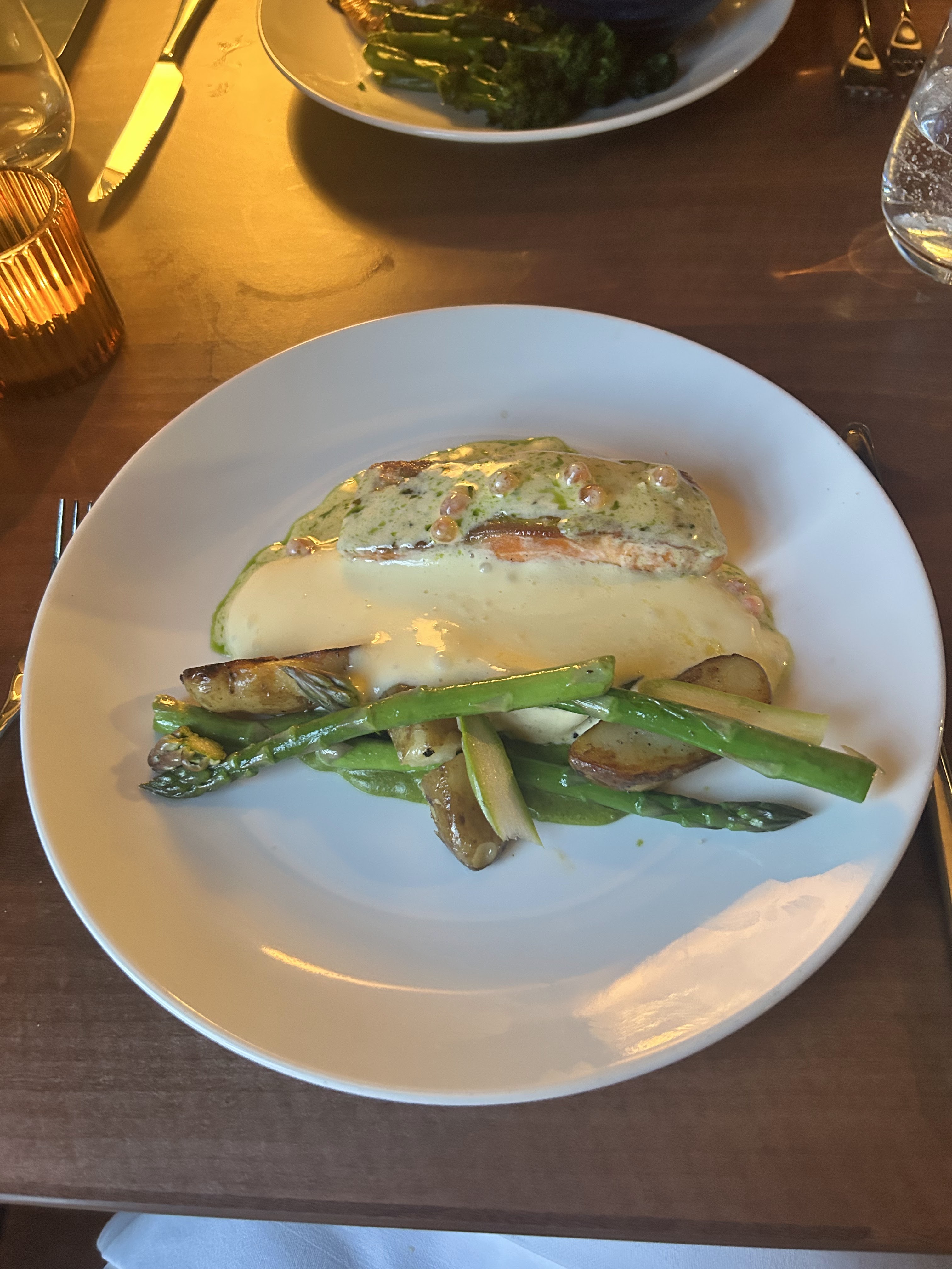 I had the Sea Trout for main course. It was faultless, the fish cooked perfectly and so full of flavour I was mentally reminding myself to order sea trout more often which is doing the chef a complete disservice. Complimented so beautifully with the duo of champagne sauce and hollandaise, the balls of roe burst through any attempts the dish had to become overly rich with salty aplomb.