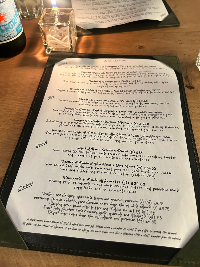 Finally, after several visits I decided to have an official ‘review visit’ to La Storia, I go about once a year so this was definitely overdue. Locally it is known as a fantastic Italian but for those further afield La Storia is a small independent just next to the cricket ground. A lot of people I know LOVE this place but my previous visits have always been tinged with annoyance (crap potatoes on a Sunday roast, my mother in law ordered a pasta dish with blueberries that looked vile). But all these people that love it – they probably had a meal a bit more like the one I had for this review.